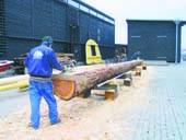 Skibstømrerne bakser med det godt 100 år gamle og 6 tons tunge stykke douglasgran, som kom til Fregatten først på året. Granens stamme skal være den midterste del af den 46 meter høje mast bagerst på Fregatten Jylland, men inden da skal skibstømrerne fra Fregattens værft møjsommeligt forme masten til først en 4-kant, så en 8-kant, en 16-kant og endelig en 32-kant før masten endelig kan få sin velkendte runde form. Den gamle mast knækkede, da den blev taget ned til renovering i efteråret 2005. På billedet ses Fregatten Jyllands skibstømrer skære den runde douglasgran til.