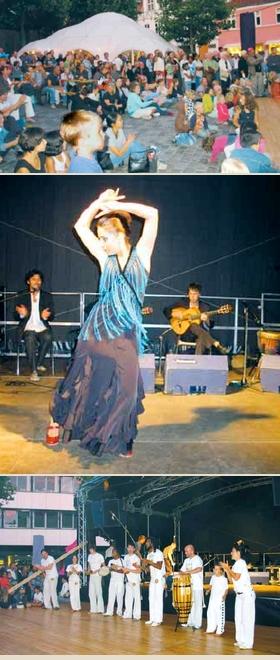 Herstående fotos er alle taget fredag aften ved Søren Kanne-scenen, hvor man blandt andet kunne opleve brasiliansk kamp-dans - også kaldet capoeira - og en fængslende optræden af truppen Arte Flamenco, der viste hvordan man dels spiller og dels danser til spansk flamenco-musik. Og det er ikke kedeligt, skulle vi hilse og sige!!