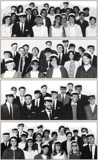 Sådan så de ud - studenterne fra Grenaa Gymnasium, årgang 1967. 40 år efter studenterhuen mødes de til fest på gymnasiet.