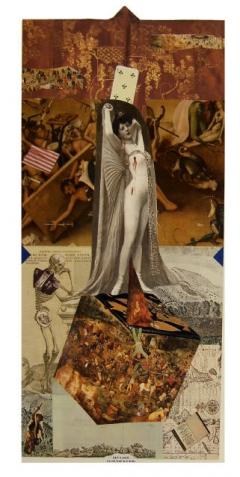 Decoupagerne er bygget op i billedkunstnerens surrealistiske univers, hvor hun sammensætter alle objekter i nye sammenhænge.