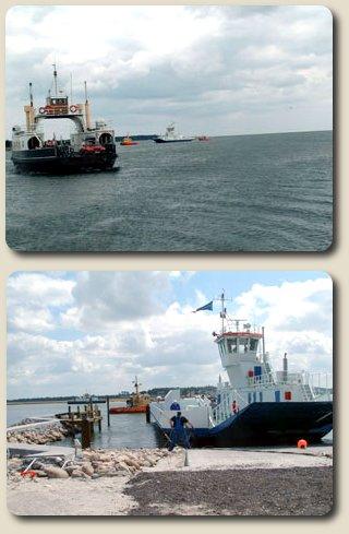 Færgen under bugsering ved indsejlingen til Udbyhøj Færgen på plads i færgelejet. (Begge billeder: Norddjurs Kommune)