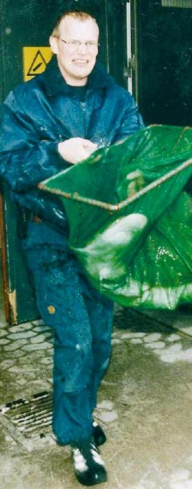 Så skulle der igen flyttes hajer i Kattegatcentret. Her er centrets direktør Jørgen Møller i sving ved en tidligere lejlighed. Alle hajer, rokker, muræner og andre fisk i hajtanken skulle i sidste uge flyttes til midlertidige bassiner forud for en større renovering af tanken, der således har skullet tømmes fuldstændig for saltvand.