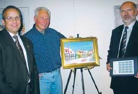 Et maleri af et sneklædt Nederstræde udgør motivet bag dette års Lions-julemærke. Maleriet er malet af Jørn Vester, og han ses her sammen med det privatejede maleri, præsidenten for Lions Club Grenaa, Hugo Andersen, og borgmester Torben Jensen i forbindelse med afsløringen af julemærket torsdag i sidste uge.