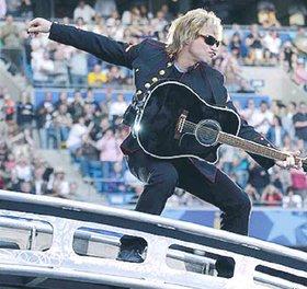 Jon Bon Jovi og hans tro følgesvende Richie Sambora, David Bryan og Tico Torres lægger vejen forbi Gl. Estrup ved Auning den 19. juni 2008 i forbindelse med deres kommende verdensturné. Her ses frontfiguren i forbindelse med en koncert på City of Manchester Stadium, der til daglig er hjemmebane for Premier League-klubben Manchester City.