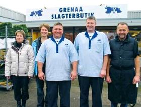 Grenaa Slagtehus v/ Peder Bertelsen og Tage Severinsen overtager slagterforretningen på Søndenå Butikstorv. Fra venstre ses Dorthe Larsen og Rikke Nielsen, der bliver butikkens ansigter udadtil, sammen med Peder og Tage og den snart tidligere ejer, slagtermester Jørgen Krog, der har drevet butikken gennem 17 år.