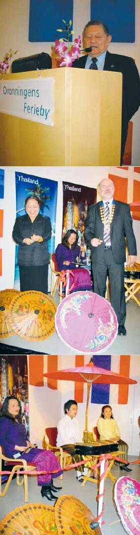 [øverst] Den tidligere Grenaa-dreng, Ib Thomsen, der nu er dansk generalkonsul i Thailand, var en slags toastmaster, da Dronningens Feriebys Venner inviterede til åbning af udstillingen »Fantastiske Thailand« lørdag før påske. [midten] Thailands nye ambassadør i Danmark, Cholchineepan Chiranond, åbnede udstillingen sammen med borgmesteren i Norddjurs Kommune, Torben Jensen. [nederst] Disse thailandske musikere sørgede for de thailandske toner i forbindelse med udstillings-åbningen.