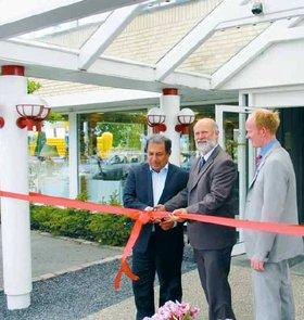 Hotelejer Enan Galaly og borgmester Torben Jensen klipper den røde snor som en markering af en ny æra for Helnan Marina Hotel på Kystvej i Grenaa, der er blevet moderniseret for ca. 30 millioner kr. Til højre hoteldirektør Mikkel Kroustrup.
