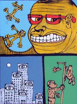 Malerierne forestiller sære, sjove, groteske væsner i tegneserieform - ikke ulig dem, som Trier selv har fremstillet på scenen.