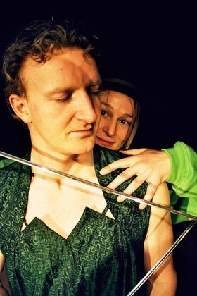 I forestillingen kæmper to skuespillere af hver sit køn om rollen som Robin. Hun vinder, og han mÃ¥ tage alle de andre roller – som Lille John, Sheriffen af Nottingham og ikke mindst som Lady Marion. De fægter og slÃ¥s med stokke, kÃ¥rder og sværd, sÃ¥ publikum jubler – og de kysser, sÃ¥ der skriges i frydefuld afsky.