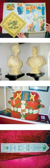 Og ellers finder man ting som royale platter, royale mønter, der er lavet om til smykker, gamle bøger og blade om de kongelige, gamle glansbilleder med de kongelige, en såkaldt smørdrittel, der er blevet brugt som syæske og som er udsmykket med det danske flag og Chr. den 10. kontrafej, finder man også på udstillingen, der også har noget så sjældent og sjovt som et forgyldt sygarniture og ske, der er lavet i forbindelse med Chr. den 10. regeringsjubilæum i 1937. Og kæmpe store buster af netop Chr. den 10. og Dronning Alexandrine, der er hentet ind på udstillingen fra muséets egne gemmer. Disse buster har oprindeligt fungeret som royal udstilling på byens fine hotel i gamle dage, Hotel Dagmar.