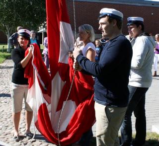 De fire første studenter på Grenaa Handelsskole hejser Dannebrog, som traditionen byder. Fra venstre er det Susanne Guldborg Barrett HG 2y, Pia Ege Andersen HGV (uden hue), Mikkel Møller Andersen HHX og Dennis Eli Kjærsgaard Andersen HG 2z.
