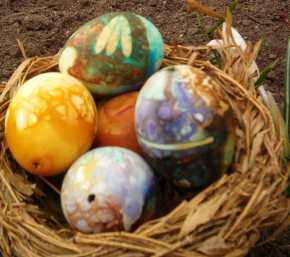 Naturens egne plantefarver er fantastiske og kan bruges til at lave flotte dekorationer på påskeæg. Æggene pakkes ind i forskellige planter, koges over bål, hvorved der fremkommer spændende mønstre.