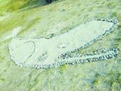 Til at understøtte denne historie havde to drenge brugt hele eftermiddagen på at lave en kæmpehval i blåmuslingskaller og sand.