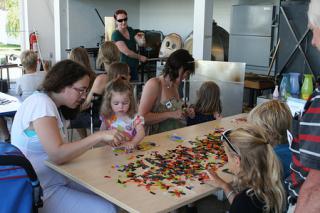 Skabe flotte farvede mønstre i værkstedet, når der er "fusing". Ved fusing laver du et mønster eller et andet motiv af små stykker farvet glas ovenpå en klar glasplade. Efterfølgende varmes det hele op i ovnen så de små stykker farvet glas smeltes fast til den klare glasplade. Efter to dage, når glasset er kølet langsomt af igen, kan den færdige fusing afhentes og tages med hjem til et minde om udstillingen og "glasbyen" Ebeltoft. -Alle kan være med - også de yngste. Det koster kr. 75 + entré til museet at lave en fusing.