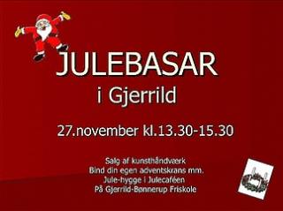 Lillegruppen på Gjerrild-Bønnerup Friskole afholder Julebasar. Her vil være stande med salg af kunsthåndværk og meget mere. Du kan binde din egen adventskrans eller lave en flot juledekoration med hjælp fra en blomsterbinder. Der er selvfølgelig også en hyggelig Julecafé med salg af æbleskiver og gløgg. Kom og vær med til at sætte julemåneden i gang. Kl. 16.00 går man i samlet flok til Bytorvet i Gjerrild og tænder det store juletræ. Måske kigger Julemanden forbi?? - Alle er velkomne.