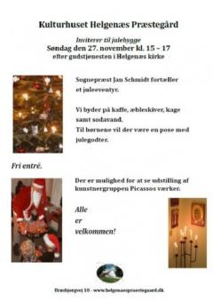 Efter gudstjenesten i Helgenæs Kirke søndag den 27. november kl. 15-17 inviterer Kulturhuset til julestue med juleeventyr, kaffe, æbleskiver, kage og sodavand. Sognepræst Jan Schmidt fortæller et juleeventyr, der vil være godteposer til børnene og mulighed for at se kunstnergruppen Picassos værker. Desuden er det muligt at købe Kulturhuset Helgenæs Præstegårds 2017 kalender. - Der er fri entré.