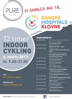 Pure Fitness arrangerer 12 timers Indoor Cykling event til fordel for Danske Hopitals Klovne. Skynd dig at købe billet og kom ud og få en fed oplevelse samt masser af hygge. Der vil være adgang fra kl. 8.00. Prisen er 610 kr. inkl. billetgebyr på 10 kr. Man kan tilkøbe frokost samt aftensmad. Frokost koster 45 kr. og vil bestå af Fuldkornspasta med kylling eller med tun/æg. Aftensmad koster 70 kr. og vil bestå af Grøntsagssalat med kyllingespyd eller Rodfrugtsalat med kyllingespyd.