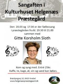 Fællessang i Kulturhuset Helgenæs Præstegård sammen med Gitte Korsholm Sloth. Kaffe, te, kage, øl, vin og vand kan købes. Kom og syng med! - Entré: 25 kr.