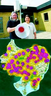 Mageløst: Internet på dåse!! - således konkluderede TV-kanalen WDR, da den tidligere på året lavede et portræt af det ukommercielle trådløse bredbånds-netværk DjurslandS.net, som i den kommende weekend er vært for et konvent om emnet i Nørre Djurs Hallen i Glesborg. På billedet ses Bjarke Nielsen og Charlotte Holst fra DjurslandS.n med det hjemmelavede antenne-grej, der indtil videre har koblet 1700 husstande på Djursland på en hurtig internet-forbindelse. I baggrunden skimtes endvidere den antennemast, som er en vigtig forudsætning for, at det overhovedet kan lade sig gøre.