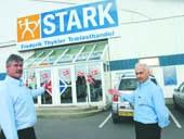 Trælastdirektør Ole Egelund og butikschef Poul Andersen foran Frederik Thykier Trælasthandel, som fremover hedder »STARK«.