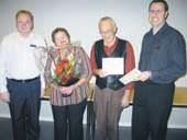 Ved den lille højtidelighed på boligselskabets kontor var der blomster og en lille check til Berit og Holger Nielsen (Gunnar Voigt måtte desværre melde afbud). På checken var der et beløb på 92 kroner - svarende til en refundering af den første måneds husleje. Der er her tale om en tradition, som boligselskabet har indført ved disse 50 års bo-jubilæer. Et jubilæum, som kun honoreres og markeres, hvis man har boet uafbrudt i den samme lejlighed i 50 år.