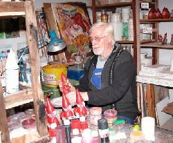 Finn Hytte i sit hyggelige værksted, hvor nisserne bliver til. Her er han i gang med at give en lille nisse sit helt personlige særpræg.