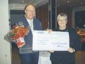 På billedet øverst får Fritz Jensen på vegne af Selvhjælpsklubberne på Djursland overrakt en check på 5.000 kr. af præsidenten for Grenaa Soroptimistklub, Jytte Schneider.