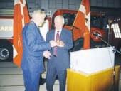 Brandmand Allan Rasmussen fra Nørre Djurs får her overrakt nøglerne til en ny motorsprøjte af beredskabschef Erik Laursen.