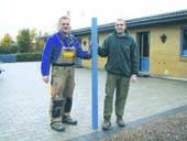 Benny Hammer fra skovplanteskolen Holmegård har skænket Stenvad Boldklub et hegn i anledning af, at seniorafdelingen har hentet hele 3 oprykninger i sæsonen 2005. Her ses Benny Hammer og formanden med en lille del af det nye hegn, der skal omkranse boldklubbens fine nye terrasse ved klubhuset.