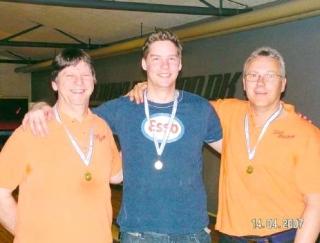 Djurs Bowlerens Herrer A-guldmedalje-vindere: Fra venstre mod højre ses far og søn, Terry og Martin Hawkins (Martin havde desværre for travlt med at få klubtrøjen af), derefter Jan Dalby. Holdets ankermand, Jess Sørensen, måtte desværre (for 1. gang), melde afbud til den sidste runde, men guldmedaljen får han selvfølgelig.