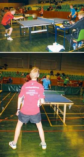 Efter aftensmad på overnatningsstedet Søndre Skole gik turen kl. 18.00 til Idrætscentret, hvor »bordteamet« i løbet af dagen havde stillet de 28 borde, bander og dommerborde op, så der var klar til bordtennis for 2-mands hold.